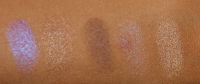 Purple shock is such a pretty lilac, Caramel Brown is a shimmery golden brown color, Brown stone is a matte medium brown, Pearl is exactly that, a shimmery pearl shade, and gold dust is a stunning yellow gold that looks beautiful on warmer skin tones.